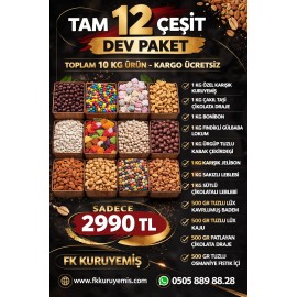 TOPLAM 12 ÇEŞİT 10 KG DEV KAMPANYA PAKETİ1 KG ÖZEL KARIŞIK KURUYEMİŞ 1 KG ÇAKIL TAŞI ÇİKOL..